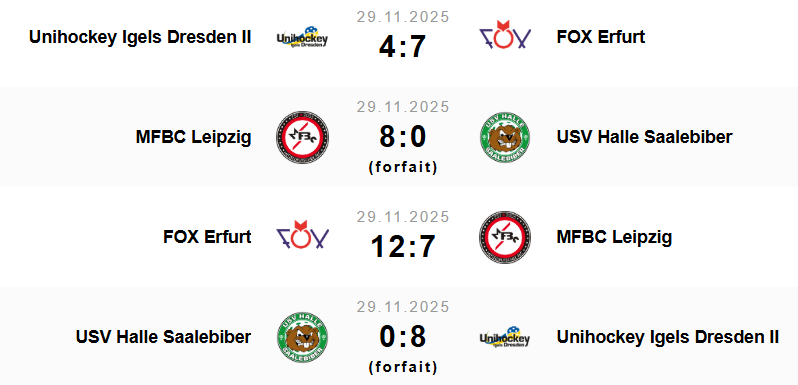 Für zusätzliche Besonderheiten am Spieltag sorgten zwei kampflose Wertungen: Da die USV Halle Saalebiber nicht antraten, wurden deren Partien jeweils mit 8:0 für die Gegner gewertet. Igels Dresden II und der MFBC Leipzig erhielten somit jeweils einen zusätzlichen Sieg.