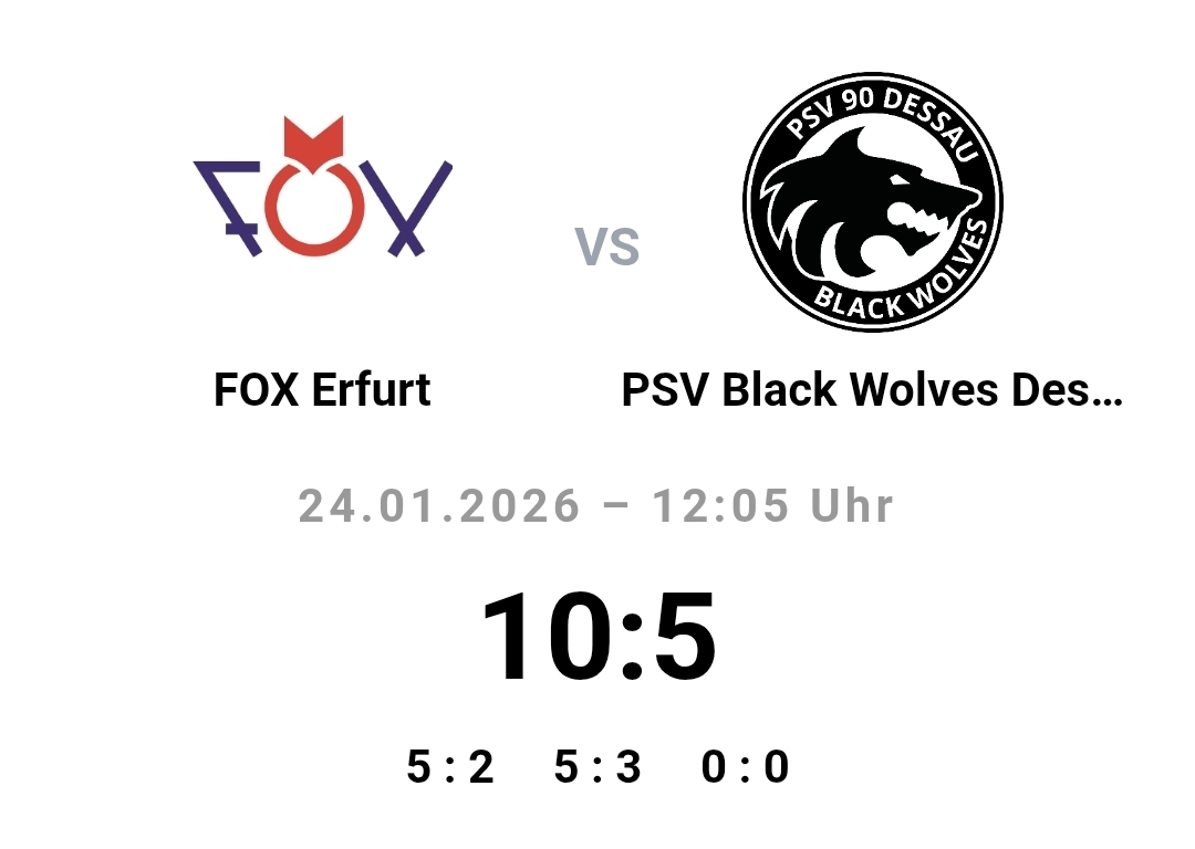 Dresden. Trotz schwieriger Voraussetzungen haben die Füchse aus Erfurt am siebten Spieltag der Regionalliga SBK Ost Kleinfeld erneut ihre Klasse unter Beweis gestellt. Mit dünner Personaldecke, einer Reifenpanne auf der Anreise und weiter Fahrt kehrten die Thüringer dennoch mit sechs Punkten im Gepäck nach Erfurt zurück.Im ersten Spiel des Tages traf Erfurt auf die Black Wolves Dessau. Nach einem zunächst holprigen Start stabilisierte sich das Spiel der Erfurter. Mit Erfurt agierte mit zunehmender Spieldauer disziplinierter und effizienter und setzte sich am Ende verdient mit 10:5 durch. Unterstützung erhielt das Team kurzfristig durch Maarten Mittmann, dessen Einsatz maßgeblich zur Stabilisierung beitrug.