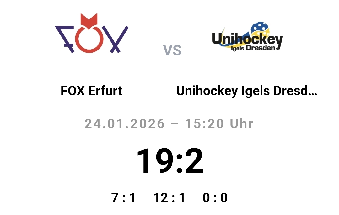Nach einer notwendigen Erholungspause stand die zweite Partie gegen die Gastgeber von Unihockey Igels Dresden I auf dem Programm. Die Erfurter fanden schnell ihren Rhythmus und nutzten ihre Chancen konsequent. Die Treffer verteilten sich dabei auf das gesamte Team.Mit zwei weiteren Siegen bestätigten die FOX Erfurt einmal mehr ihre starke Saisonleistung. Bereits in einer Woche steht der nächste Spieltag im Erzgebirge an, wo die Thüringer auf die Gastgeber aus Buchholz sowie das Team aus Bautzen treffen werden.
